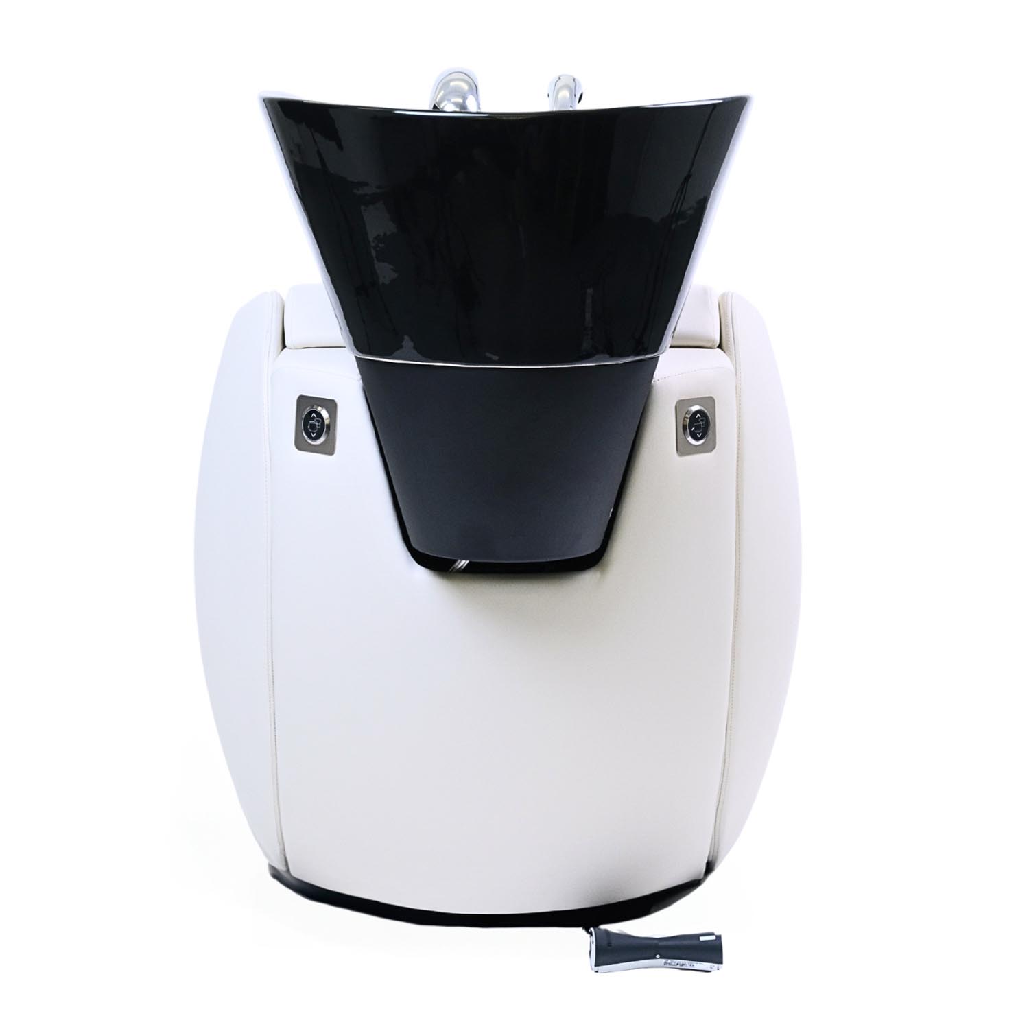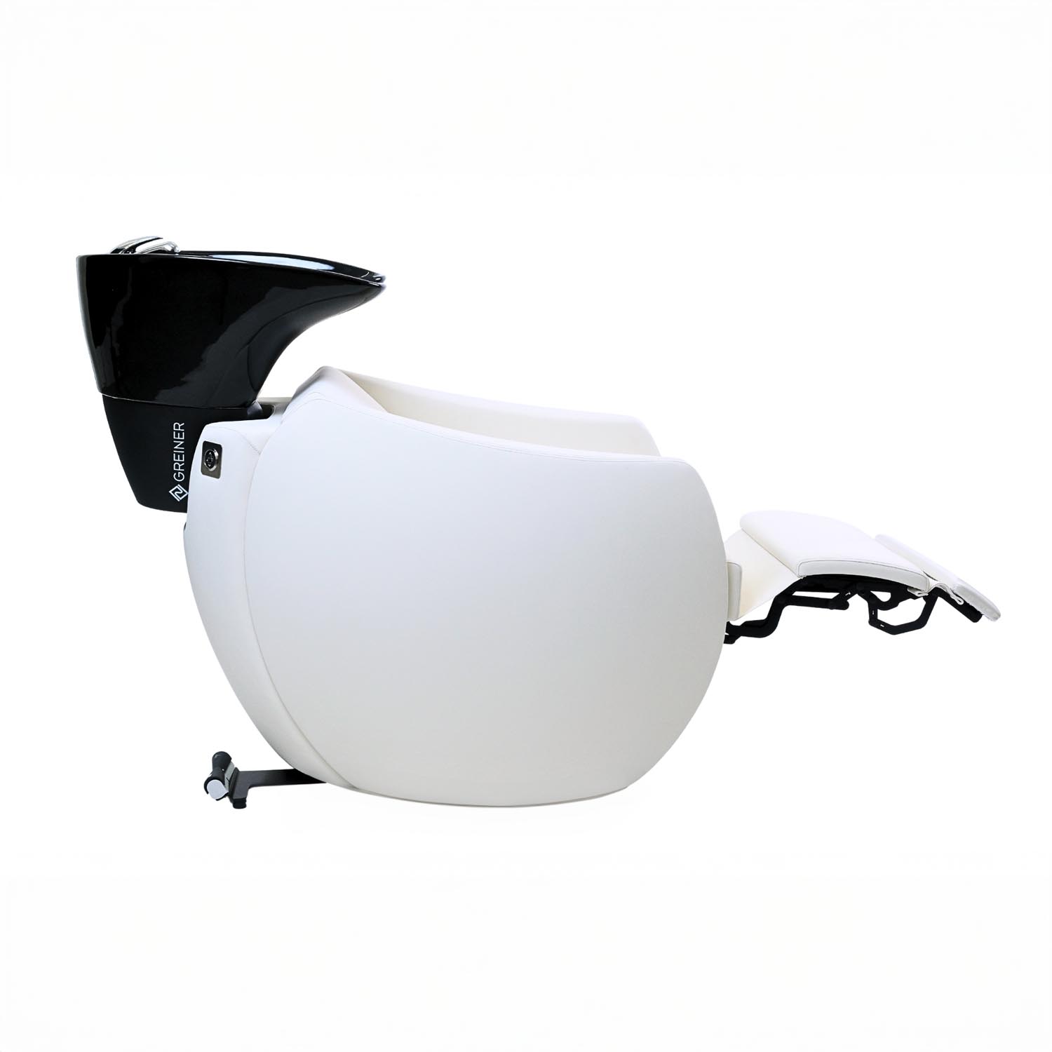 tondolore, GREINER's new washing unit, inspires. Concentric radiuses interlock in a harmonious and dynamic way - here corpus and basin, smooth and hard, merge into a unit. tondolore is available with "wellness fitting", i.e. with an electrically adjustable legrest and/or massage unit in the backrest. The basin comes in black or white. The seat and backrest upholstery can easily be removed completely in order to have free access to the internal space where the installation and fixing elements of the shampoo chair are hidden.