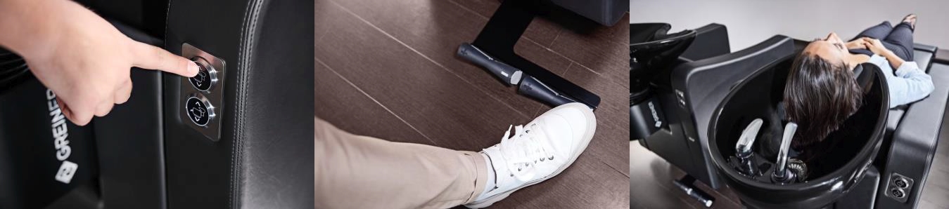 Ergonomie und Rückenschonung bei der Arbeit liegen uns ebenso am Herzen: daher lässt sich die Waschanlage mit Höhenhub an die perfekte Arbeitshöhe anpassen. Bedienung mit Touch hält die Hände frei, sanfte Bewegungen und leise Motoren schaffen eine angenehme Atmosphäre. Leise und soft per One-Touch-Tastendruck bewegt sich die Beinauflage, ebenso die Massageeinheit mit 3 Intensitäten. Ein Tipp mit dem Fuß fährt den Waschsessel punktgenau in die Höhe und Liegeposition, per Double-click dann wieder zurück in die End- oder Grundposition.